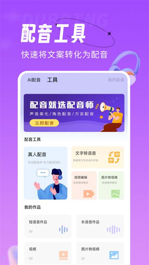 配音师ios版是一款简洁好使的配音工具,是由长沙原力互联网科技公司独立研发,并且可以不依赖电脑PC端,全部都通过手机完成录音剪辑、视频剪辑合并,视频剪辑制作,长视频剪辑、短视频合并,自主配音,自选当地和视频编辑软件音乐等操作,而且还拥有大量样音模板文案,优质背景音库,是你地摊叫卖、广告营销、商场宣传活动合成配音,或者个性听书、彩铃制作、儿童配音,必不可少的手机APP。配音师中提供了方言配音、儿童配音、女声、男声等多种配音选择,无论是广告配音,还是视频配音,亦或是简单的文字转语音都很好。图片转视频,自概念编辑文字配音播放,也可进行视频文件编辑,对视频文件添加我们的录音或者是自概念文字配音,添加背景音乐都比较便捷。并且操作简单,对于有需要的用户来讲,这款软件是很可靠的助手哟,欢迎有需要的用户来本站免费下载用。
