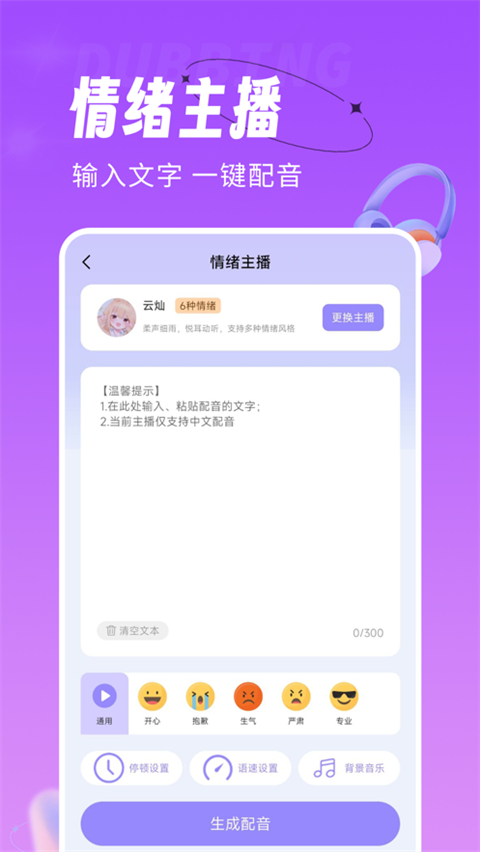 1、智能合成:试听合成样音,选择心仪的虚拟配音员音色,导入需要合成的文本并选择背景音,进行合成配音。合成配音多语言多音色可选,中文中文、特点地方言,男声、女声任你选,更支持语速、音调、音量设置。